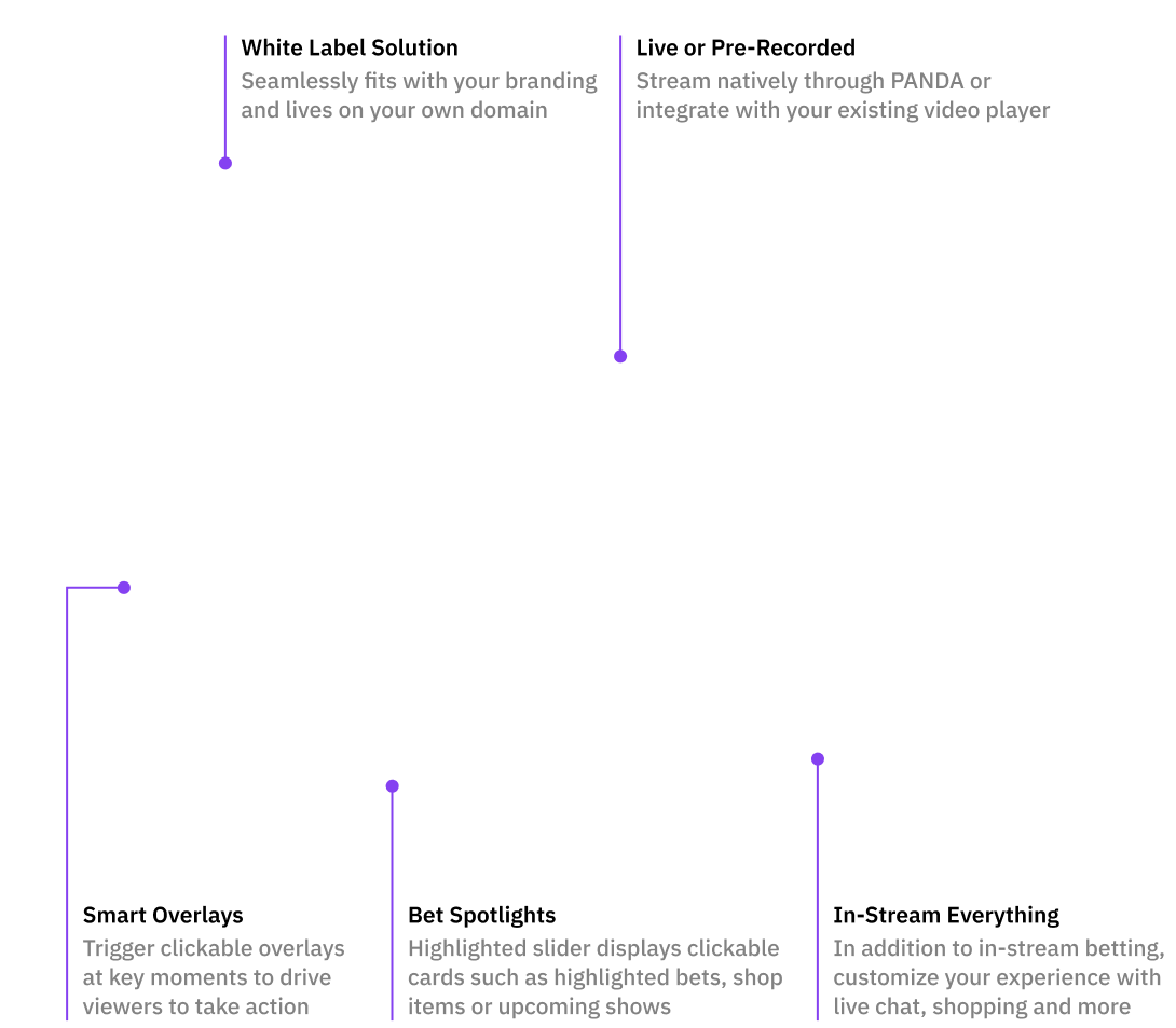 Generate more revenue and engagement instantly. Built specifically for the confluence of online sports betting and digital media, PANDA's Watch & Bet platform drives signups, betting velocity, and deposits while offering an immersive lean-in viewing experience that fuels engagement and customer retention.