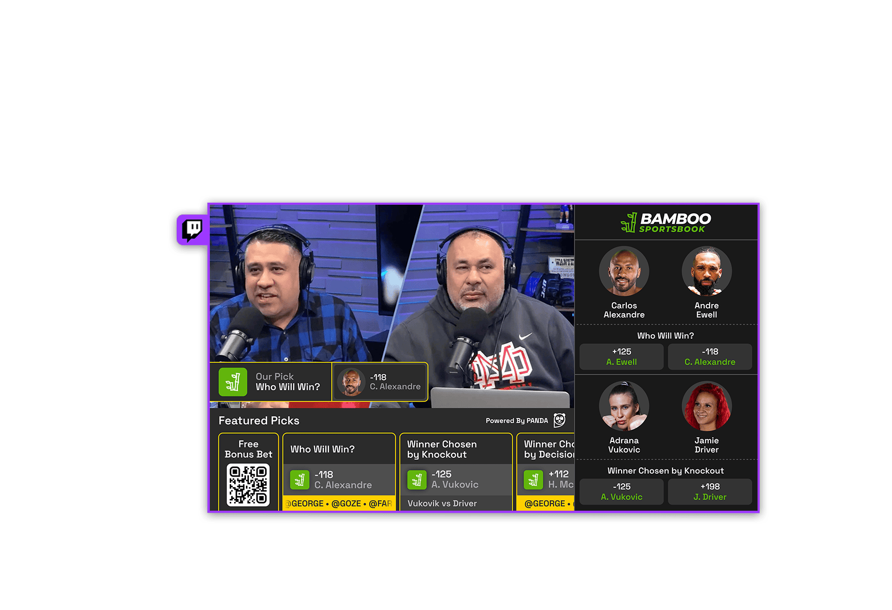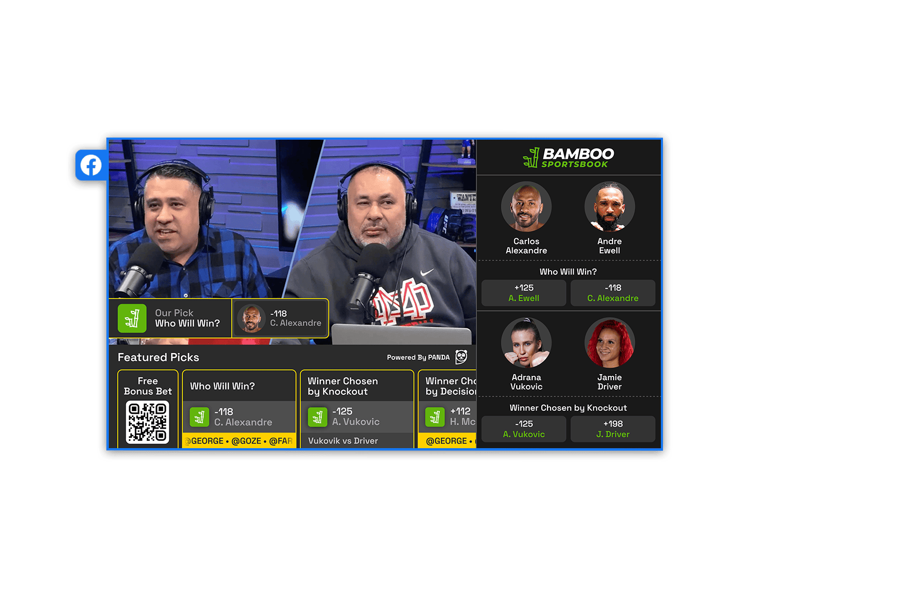 More than just sports betting, PANDA lets you add live chat, curated social content, and even clickable on-air graphics to your streams. The result? Lean-in viewing experiences that keep viewers engaged and coming back for more.